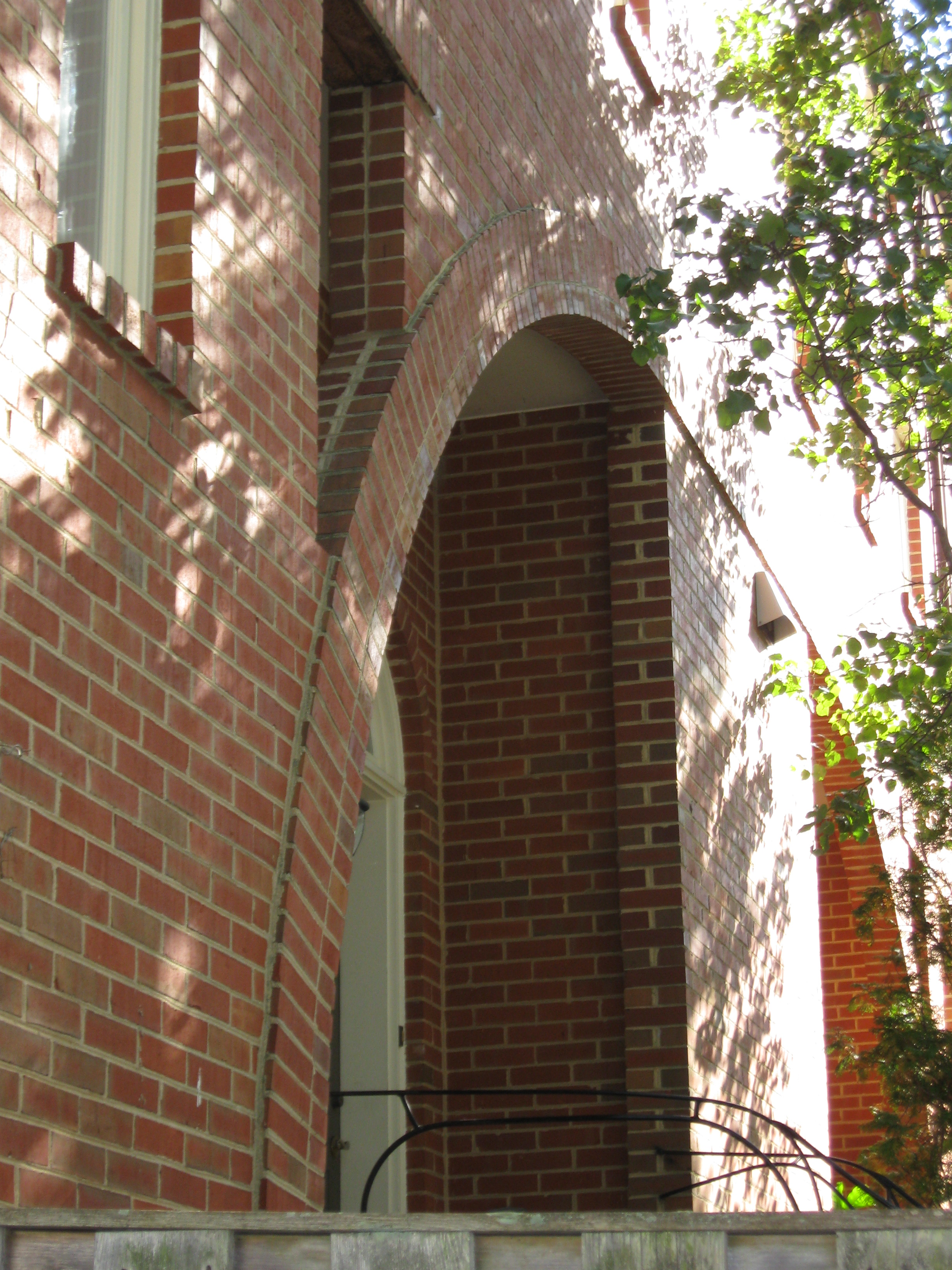 The four-story units are open from front to rear on the main living floor. At the rear garden a sun porch is oriented directly south. Built over the tile covered concrete, this space gains direct solar heat which can be introduced into the rear bedroom. The main living floor in every house has a stair rail carved by a wood sculptor. A family room/den below this floor opens into a sunken front garden. The railings around this garden and on the “bridge” from the sitewalk to the house were built on site by a metal sculptor. At the top floor of the houses, above the second floor bedroom, is a skylighted studio.